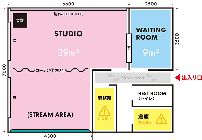 スタジオの広さ: STUDIO 39㎡ / WEITING ROOM 9㎡